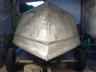 After sandblasting with Black Beauty media, the bottom is now primed and painted with Awlgrip.